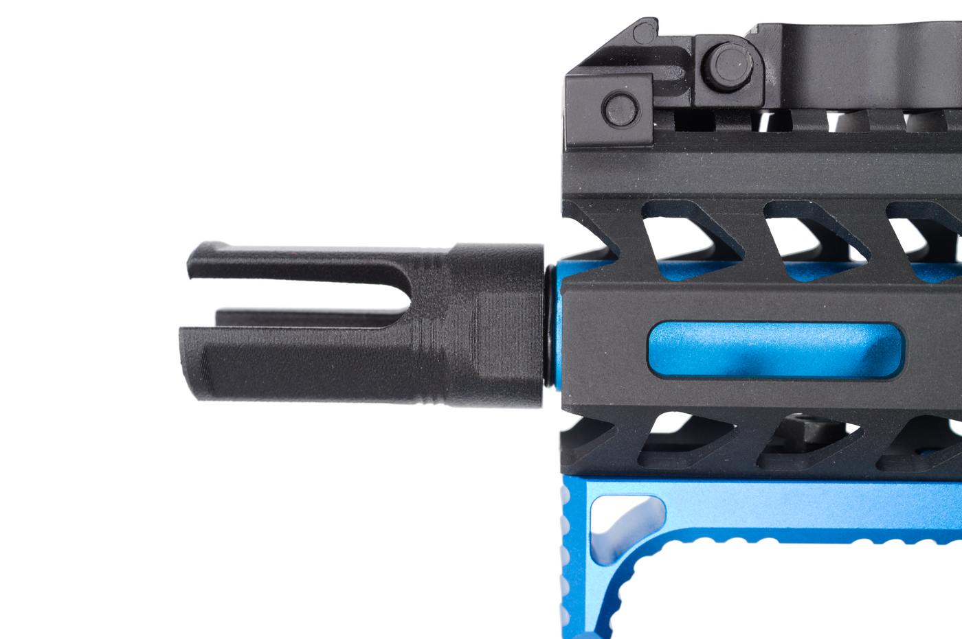 The 3‑Prong Muzzle Device (MD‑2) features a three‑prong open‑ended design that delivers a streamlined, minimalist front‑end profile. Its clean geometry enhances the overall silhouette of the platform, making it well‑suited for compact or lightweight builds.